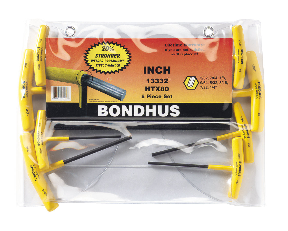 BONDHUS HTX80 T-Handle Hex Driver 8pcs Imperial Set 3/32"-1/4", 13332 - Hex Tip Graduated Length T-Handle Set of 8 pcs w/ProGuard™ Finish. Includes sizes: 3/32", 7/64", 1/8", 9/64", 5/32", 3/16", 7/32" & 1/4"