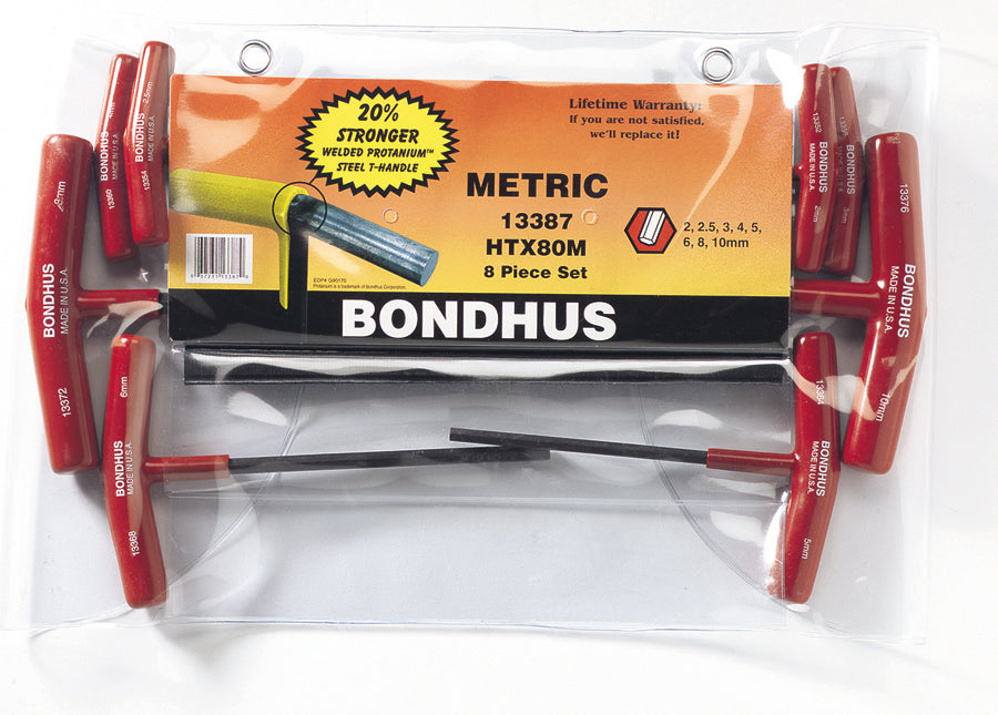 BONDHUS HTX80M T-Handle Hex Driver 8pcs Metric Set 2mm-10mm Graduated Lengths, 13387 - Hex Tip Graduated Length T-Handle Set of 8 pcs w/ProGuard™ Finish. Includes sizes: 2mm, 2.5mm, 3mm, 4mm, 5mm, 6mm, 8mm & 10mm