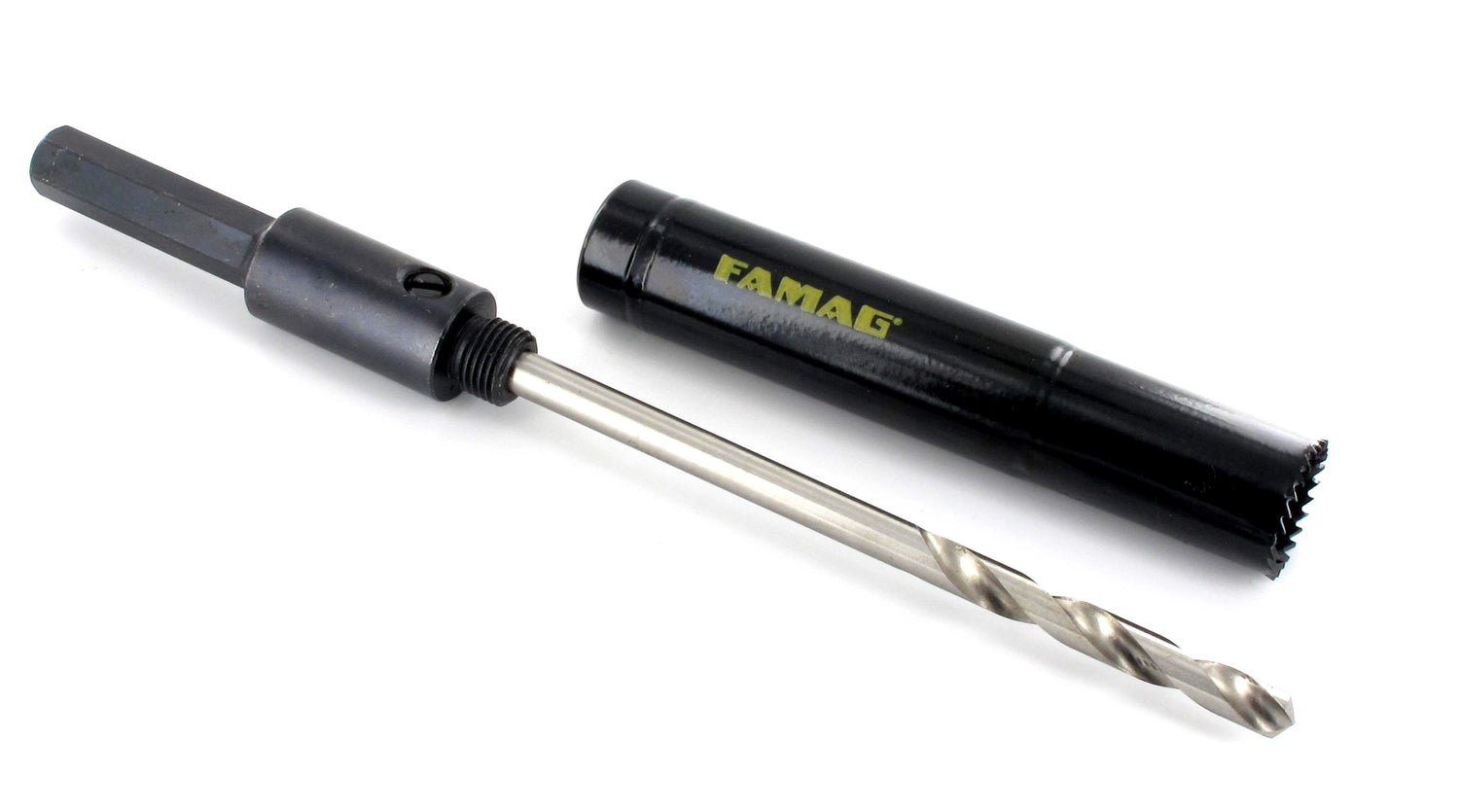 FAMAG Bi-Metal hole saw for roller shutter, HSS, without shank and pre drill, OØ22 mm, 2174122 - Special hole saw of HSS bi-metal to install roller shutters in window frames. Incl. hexagonal shank and pre-drill bit to place the hole saw in position. During the installation of the roller shutter you have to drill holes in the window frames for the belts. This was always an issue, but with this hole saw it is properly solved. Remove the pre-drill bit from the hole saw after the first cut. This reduces the cutting forces and it works much more easier. HSS Bi-metal 500 - 750 rpm