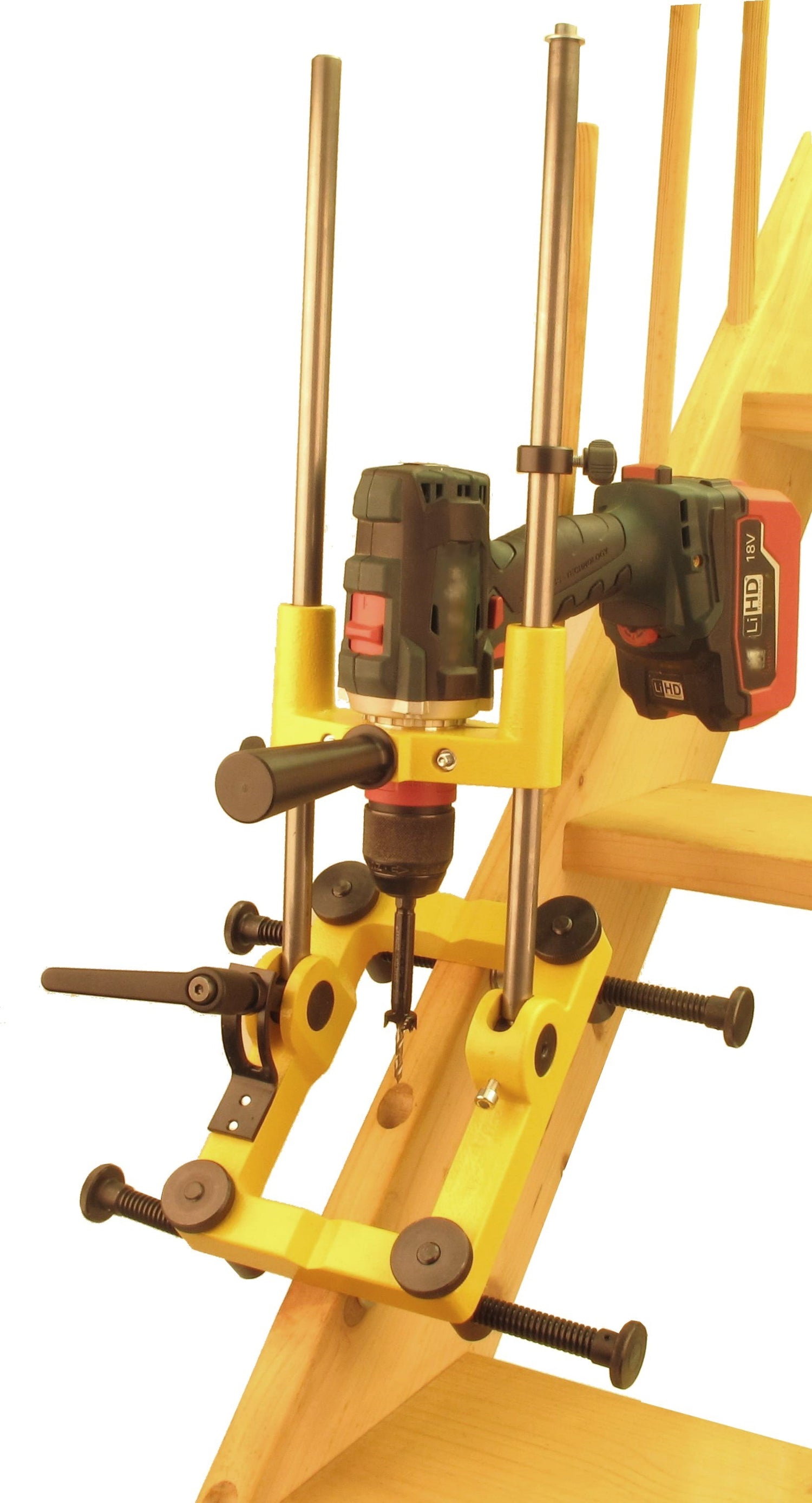 FAMAG Drill Rig for stairs building includes fixture pivoting version inc Fixture, 1406322 - With additional handle, stageless adjustable depth stop and pivoting range up to 45°. Easy setting by clamping lever. Plate for drill bush and springs are not included in scope of delivery. For power drills collar diameter 43 mm. Precise drilling in exact 90 -45° setting angle, especially suitable for the construction of stairs. 1402.000: mountable on all FAMAG drill rigs with square foot. Due to the pivoting fixture also applicable for curved cheeks. For staircase > 45° please use a shim. Tool holder and foot made of cast aluminium. Guide posts made of stainless steel