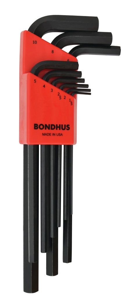 BONDHUS HLX9M Hex Key 9pcs Metric Set 1.5mm-10mm 12199 - Hex Tip Hex Key L-Wrench allen key Set of 9 pcs w/ProGuard™ Finish. Long Arm. Packaged in Bondhex™ Color Coded Case. Set Includes: 1.5mm, 2mm, 2.5mm, 3mm, 4mm, 5mm, 6mm, 8mm & 10mm